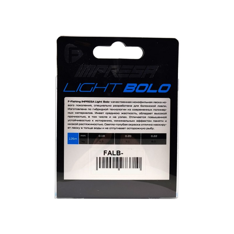 F-FISHING Леска Impresa Light Bolo Light Blue - качественная монофильная леска нового поколения, специально разработана для болонской ловли. Изготовлена по гибридной технологии из современных полимерных материалов. Имеет среднюю жесткость, обладает высокой прочностью, в том числе и на узлах. Отличается повышенной устойчивостью к истиранию, минимальным эффектом памяти и низкой растяжимостью. Светло-голубая окраска отлично маскирует леску в толще воды и не отпугивает осторожную рыбу.