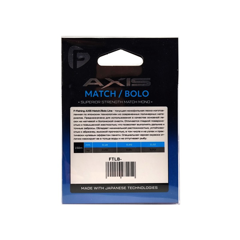 F-FISHING Леска Axis Match Bolo Line Black - тонущая монофильная леска изготовленная по японским технологиям из современных полимерных материалов. Предназначена для использования в качестве основной лески на матчевой и болонcкой снасти. Отличается гладкой поверхностью и повышенной жесткостью, что позволяет выполнять дальние и точные забросы. Обладает минимальной растяжимостью, устойчивостью к абразиву, высокой прочностью, в том числе и на узлах и практически нулевым эффектом памяти. Специальная черная окраска отлично маскирует ее в толще воды и не отпугивает рыбу.