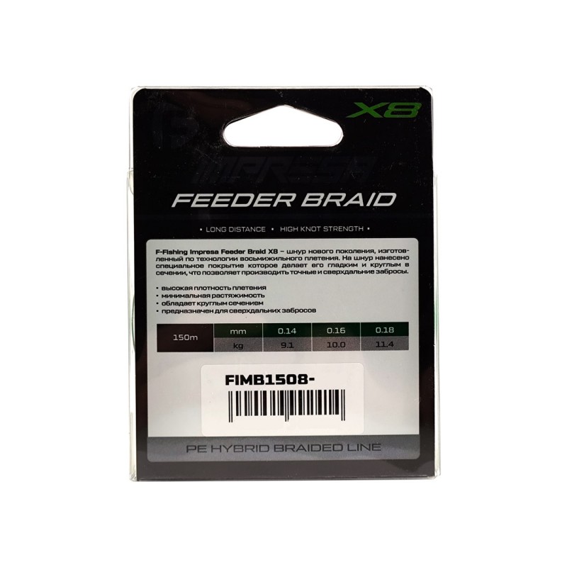 F-FISHING Impresa Braid PE X8 Feeder 150м Green — это высококачественный плетёный шнур нового поколения, созданный с применением восьмижильной технологии. Благодаря специальному покрытию и восьмижильному плетению, шнур отличается исключительной гладкостью и круглой формой, что обеспечивает точность и дальность забросов. Высокая плотность плетения и минимальная растяжимость делают его особенно чувствительным, что положительно сказывается на общей эффективности снасти. Эти шнуры подходят для широкого круга рыболовов и обладают отличной прочностью и долговечностью. Они выпускаются в размотке 150 метров и наиболее популярных диаметрах.