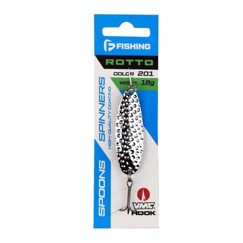 Колеблющаяся блесна F-FISHING Rotto обладает узким и овальным телом, благодаря чему она превосходно преодолевает дальние расстояния при забросах. Блестящая, в точечных выемках, поверхность приманки напоминает чешую, которая великолепно играет на свету и эффективно привлекает хищную рыбу. F-FISHING Rotto комплектуется острейшим тройником и фирменными кольцами VMS. Серия представлена золотой и серебристой моделями, а также сочетанием серебристого и золотого покрытия с красным, синим или зеленым цветами, что позволяет выбрать подходящую модель под конкретное место и условия лова. Опытные рыболовы отмечают, что F-FISHING Rotto наиболее уловиста при ступенчатой проводке в охоте на крупную щуку и судака.