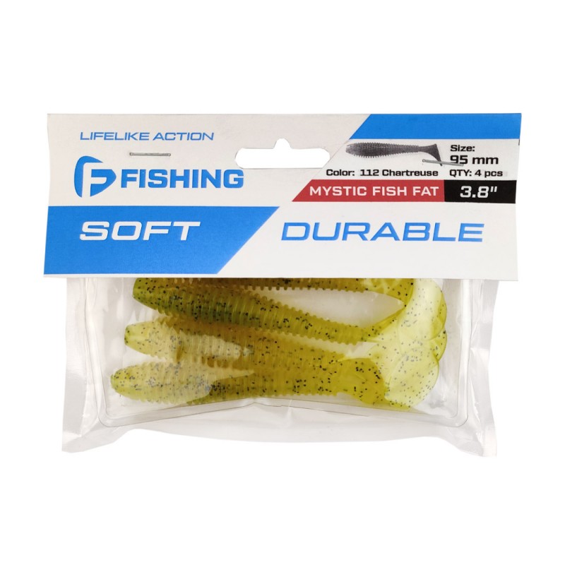 F-Fishing Mystic Fish Fat – популярнейшая серия недорогих уловистых виброхвостов с широким диапазоном расцветок. Фирменный материал, из которого изготовлена приманка, имеет высокую аттрактацию. Он эластичный и долговечный, что способствует длительному сохранению рабочих характеристик. Приманка «съедобная», обладает сильным и устойчивым запахом. Благодаря наличию соли в составе материала хищник удерживает такую приманку в пасти дольше, чем обычную, и поклевки чаще заканчиваются результативной подсечкой.